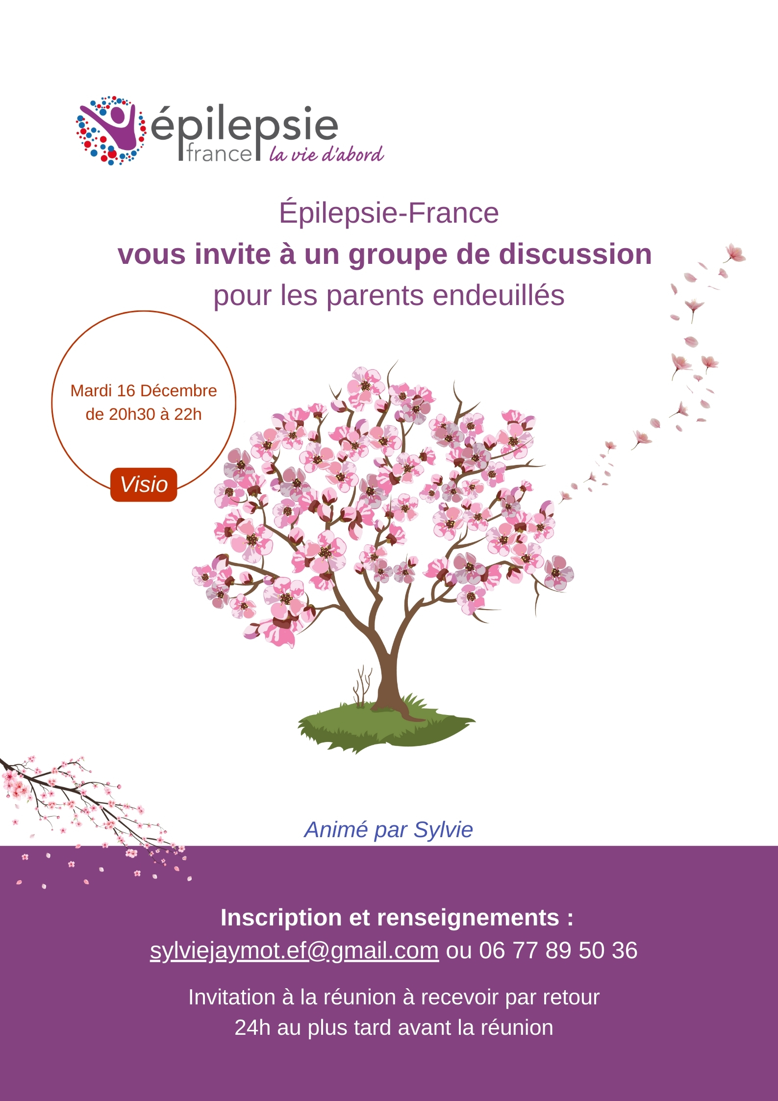 Épilepsie-France vous invite à un groupe de discussion en visio, pour les parents endeuillés, Mardi 16 décembre de 20h30 à 22h. Inscriptions et renseignements